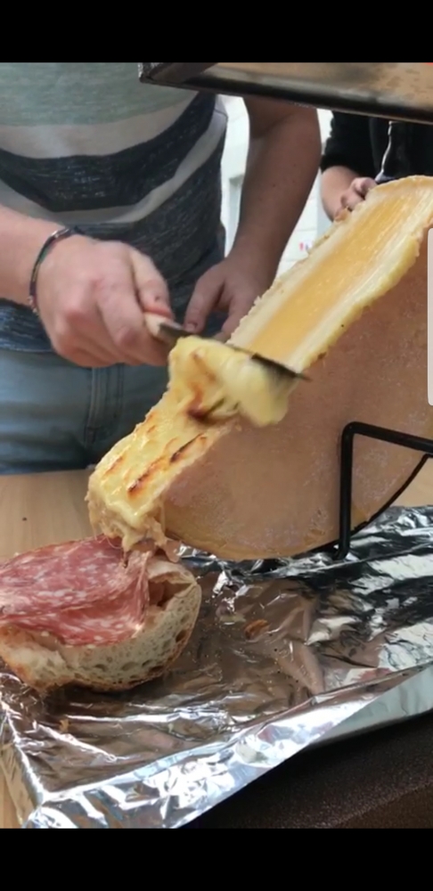 - streetfood stand, raclette sandwiches melted raclette chesse on crispy sandwich with different toppings like serrano ham and rocket salad.